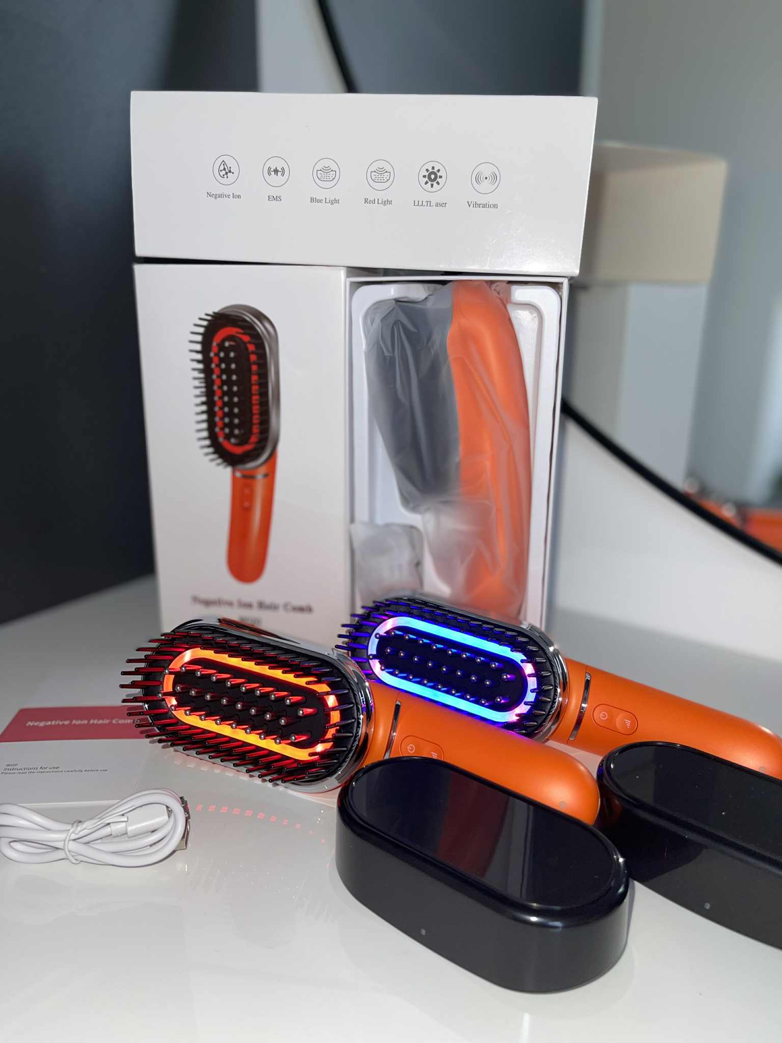 Šis daugiafunkcis prietaisas sujungia pažangiausias technologijas: jonizavimą, EMS mikrosroves, mėlyną ir raudoną LED šviesą, vibraciją ir LLLT lazerį – visa tai viename ergonomiškame ir stilingame įrenginyje!